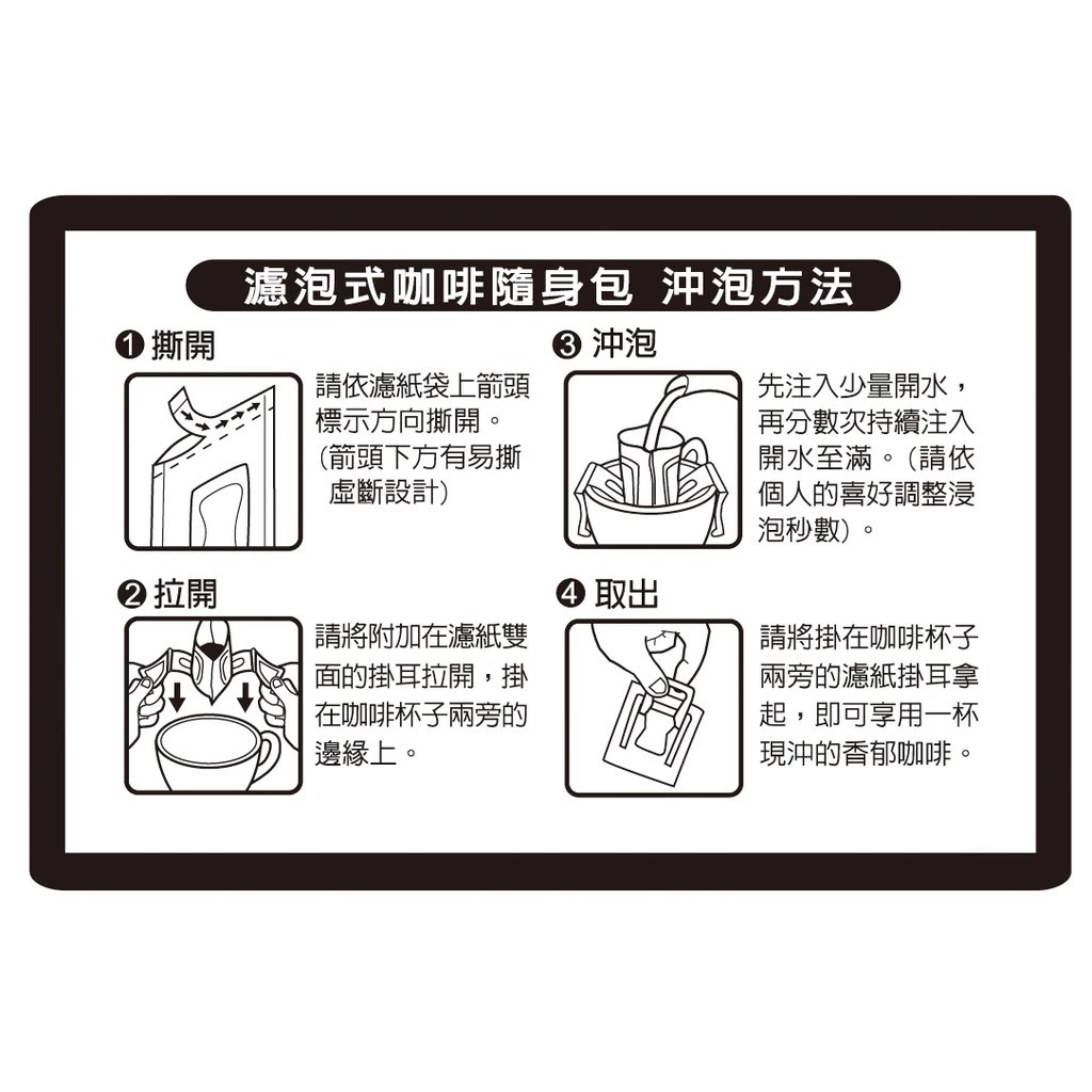 簡介: 高g重掛耳包風味更足 方便濾泡、快速簡便 成分:100%原豆焙炒咖啡 風味描述: 可可、煙燻味、香氣 口感: 渾厚均衡圓潤 規格:12g x 10入 / 盒 保存方式:避免高溫潮濕及陽光直射