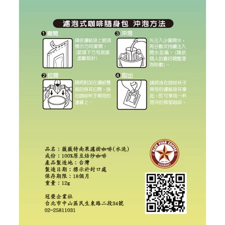 簡介: 高g重掛耳包風味更足 方便濾泡、快速簡便 成分:100%原豆焙炒咖啡 風味描述: 堅果、焦糖、巧克力、黑櫻桃 口感: 甘醇順口 規格:12g x 10入 / 盒 保存方式:避免高溫潮濕及陽光直射
